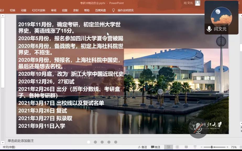 为了进一步提高公司员工的考研热情,明确考研目标,掌握考研技巧,2021年11月6日晚,公司2021年就业服务系列活动之员工考研经验云分享在腾讯会议上准时举行。本次活动有幸邀请到已经考研上岸的17中文1班卢彦如学姐、17历本闫文元学长、17创中厉子聪学长以及17广告张江科学长分享各自考研经验。