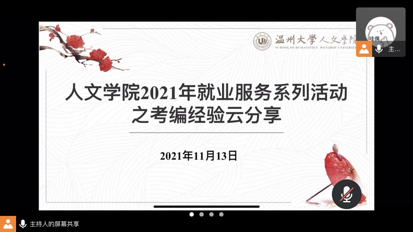 2021年11月13日晚上,公司2021年就业服务系列活动之员工考编经验云分享在腾讯会议上拉开序幕。本次活动邀请了四位成功考编的员工参加,向诸多有考编意向的学子分享经验、答疑解惑。