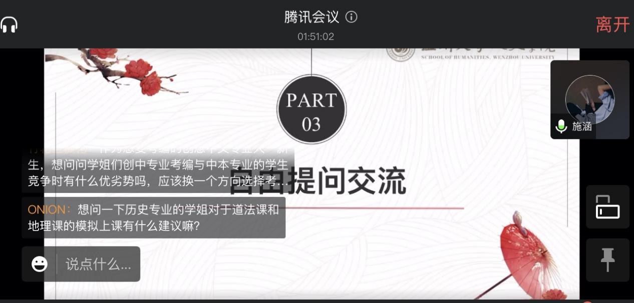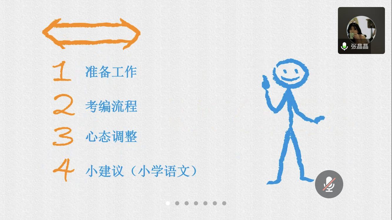 会议伊始,院学工办辅导员李丹萍老师阐明举办云分享活动的初衷与远景,期望大家都能有所收获,并感谢员工对母校工作的大力支持。随后是员工分享环节。毕业于17中文2班的张晶晶学姐就前期准备工作、考编流程、心态调整与小学语文备考的一些小建议四个方面展开经验分享。她强调自信、亲和力与礼貌是面试与试课中的重中之重,认真地研读课文亦是成功的基石。17历史(师范)班的施涵学姐以“工欲善事先利器”、“巧干亦能捕雄狮”、“它山之石可攻玉“、“风物长宜放眼量”等数句古语为主题,向大家提出了数点宝贵的意见,希望大家能做好自我成长规划,“凡事预则立,不预则废”。目前工作于杭州湖畔公司的17中文1班邢柏怡学姐,以她的座右铭“千里之行,始于足下”为主题具体讲述了她的考编历程。学姐强调,要做一个有心的人,关注公司的校史校情。17历史(师范)班的叶梦炯学姐主要分享了信息获取的来源、考编历程与复习流程,她建议大家放平心态,多做尝试,重在积累。
