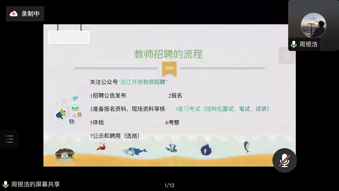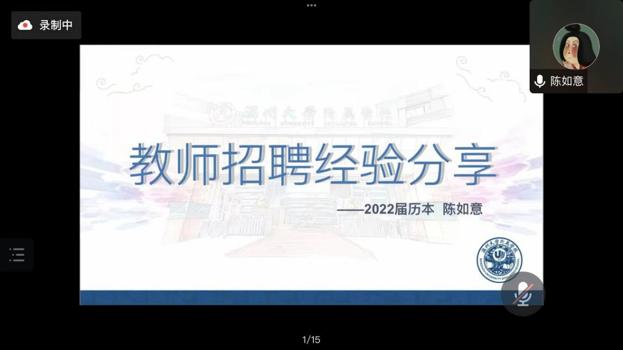 18中文1班周银浩学长就教师招聘流程、结构化面试、笔试、试讲、考编到底难不难五个方面展开经验分享。对于笔试、试讲越来越灵活的问题,学长表示我们应加深对课文的熟悉和理解,以最好的姿态来迎接挑战。18中文2班周旻炯学姐建议大家应先明确自己的基本情况,再进行精准的信息筛选。在考编准备方面,学姐分享了结构化面试的优胜技巧以及试讲中亮点呈现的方法。她强调,在备考中一定要反复阅读教参,将其读熟、读透,同时要注意心态的调整。18创意中文杜茹艺学姐围绕“信息战”、拼命努力、心态调整三方面内容展开分享。在信息战方面,学姐建议组队备考、信息共享。学姐说道:“要有考第一的野心并付出十分努力”、“养兵千日,用兵一时”、“道阻且长,行则将至”。18历史(师范)陈如意学姐就仪容教态、待人接物、语言表达等方面的面试增分细节进行分享。对于模拟上课,学姐还分享了A4教学设计法,希望能对同学有所帮助。