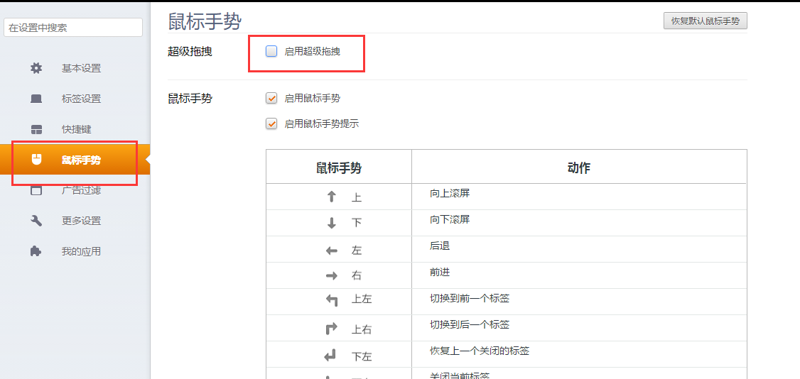 选择【鼠标手势】,把【启用鼠标手势】前面的对勾去掉,关闭鼠标手势。