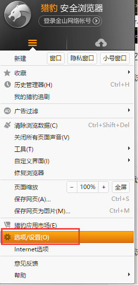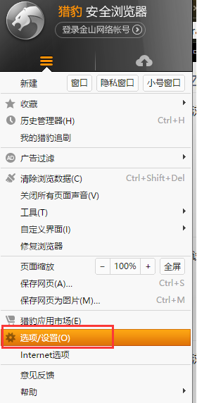 点击浏览器左上角“猎豹头像”按钮,点击【选项/设置】