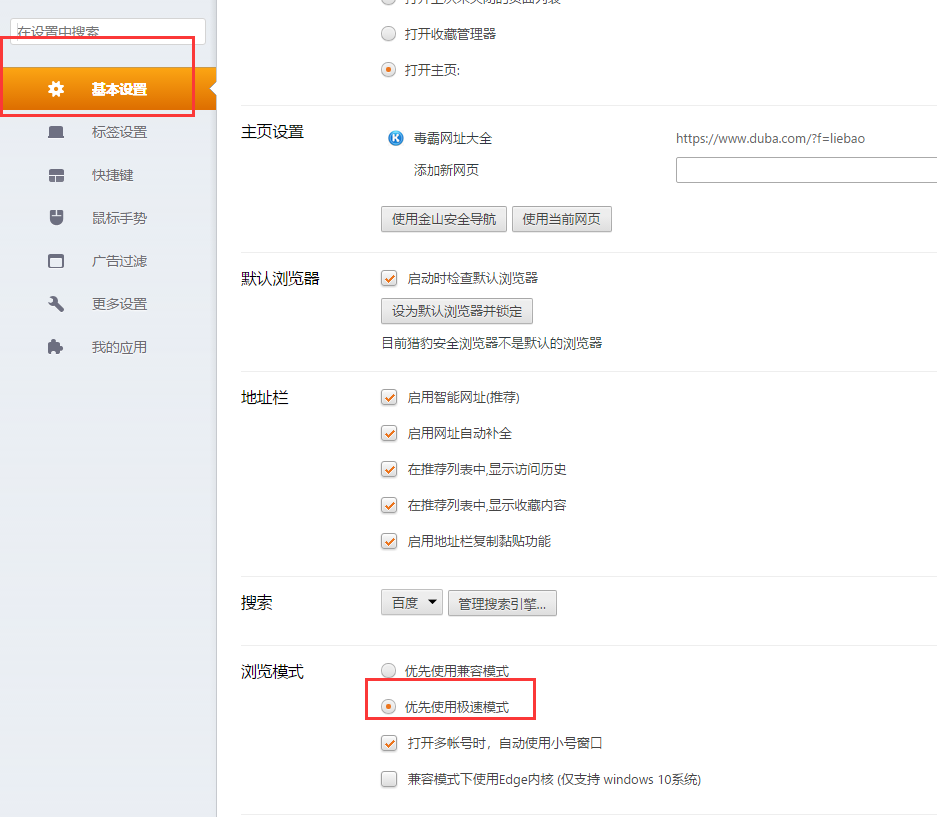 选择【基本设置】,在浏览模式中选择【优先使用极速模式】。