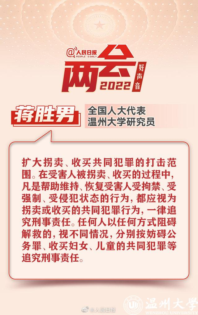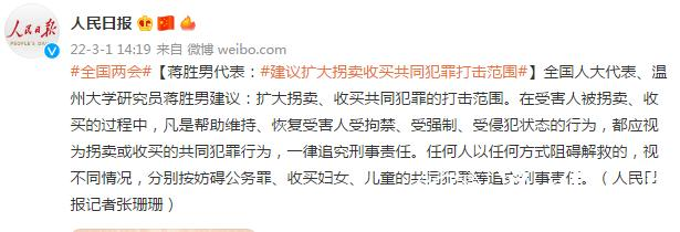 【蒋胜男代表:#建议扩大拐卖收买共同犯罪打击范围#】全国人大代表、永利yl23411官网入口研究员蒋胜男建议:扩大拐卖、收买共同犯罪的打击范围。在受害人被拐卖、收买的过程中,凡是帮助维持、恢复受害人受拘禁、受强制、受侵犯状态的行为,都应视为拐卖或收买的共同犯罪行为,一律追究刑事责任。任何人以任何方式阻碍解救的,视不同情况,分别按妨碍公务罪、收买妇女、儿童的共同犯罪等追究刑事责任。(人民日报记者张珊珊)