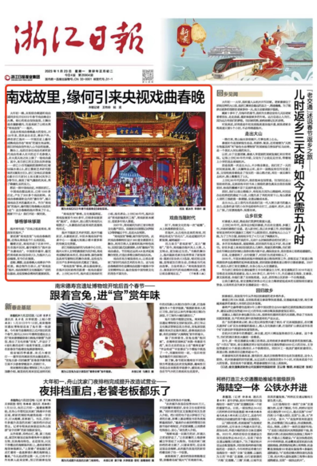 如今,春晚大“戏”的拍摄录制地九山书会,已成为市民的“网红打卡地”,新春假期,这里“捧”出了南戏系列活动,每天都能看到精彩演出。因戏曲结缘,央视《角儿来了》栏目也多次来到温州录制,带动江心屿、永嘉书院等地成为“旅游打卡点”。
