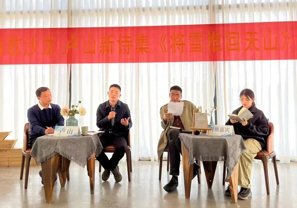 在对谈环节中,李广旭、弦河、唐旧、赵婧亦、壬阁、沙漠、潘玲玲、王静新等嘉宾上台与卢山进行了对谈。温大中文系副主任李广旭认为卢山是一位富有感受力的诗人,从江南到疆南,不仅是风景意象的变换,还有诗人心境的变迁。青年诗人弦河评价卢山的诗歌语言给我们打开了一幅画卷。青年诗人唐旧认为,卢山去掉了对语言方面的一些修饰,更关注情感,关注了他所看到的真实。诗人沙漠提到卢山的诗为我们带来了开阔雄厚而苍凉的诗意。诗人王静新细致分析了卢山的诗歌,提到天山为卢山的写作赋能,使他能够从相对安逸中实现自我突破。