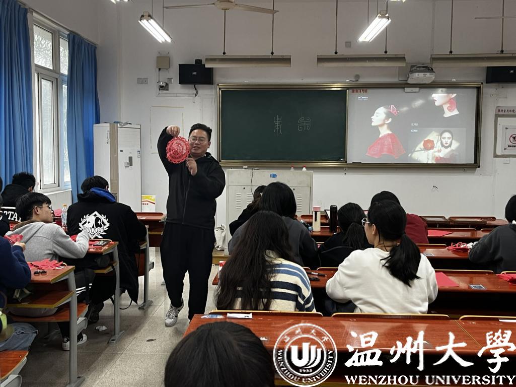 课上,温州市剪纸技艺传承人朱铭向同学们抛出“是先有纸还是现有剪纸”的问题,将同学们引入到它的课堂中。他向同学们讲解剪纸的六种方式:剪、刻、划、撕、钻、烧。结合温州民俗生活,给同学们介绍剪纸的样式。他说到:“我们的家乡温州可是‘百工之乡’,细纹刻纸是用来装饰花口大龙的,而九月九送舅舅的‘登高’也是用剪纸装饰,温州各式龙灯上都有精美的剪纸作品作为点缀。”朱老师的上课方式极具个人特色,它的PPT没有文字,只有一幅幅图片,朱老师用他有趣的语言搭配他绝妙的口才为我们上了一节生动有趣的剪纸课,带领我们领略到温州剪纸的魅力!