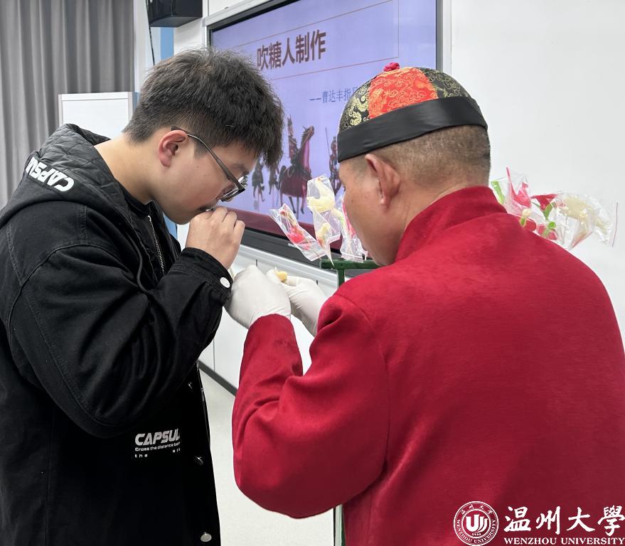 温州市吹糖人技艺传承人曹达丰老师在上课前先给同学们介绍吹糖人相关的故事以及他与“糖人”之间的不解之缘,之后便亲自示范他是如何吹出一个栩栩如生的糖人。只见曹老师对着糖块的口一边吹气一边动手捏,不一会儿一个栩栩如生的兔子就做成功了,看到曹老师如魔法般地变出一个“糖兔子”,同学们纷纷鼓掌赞扬,并跃跃欲试地想自己亲手体会吹糖人的快乐。在曹老师的指点下,同学们渐渐掌握了吹气的技巧,和曹老师一个吹一个捏,配合得相当默契,技术熟练的同学还能自己边吹边捏,形状也是根据自己的兴趣随意发挥,有老虎、葫芦、鱼、老鼠等等。“这种能自己动手边做边吃的课堂真是太快乐了,学的还是非遗知识呢!”临近课堂尾声时,张同学发出这样的感慨。