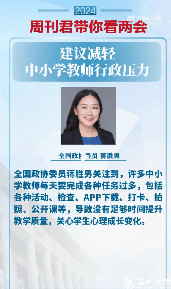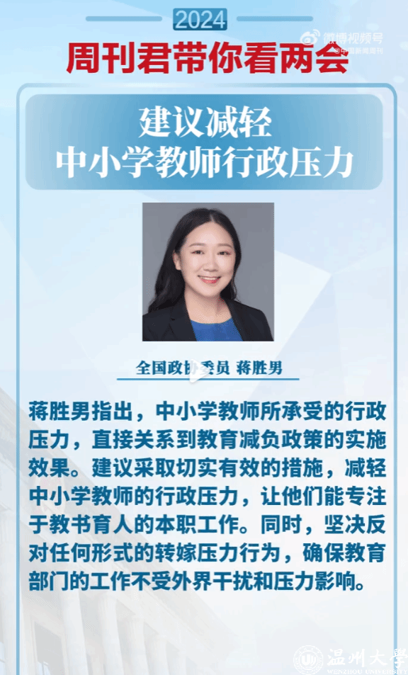 【蒋胜男委员:#建议减轻中小学教师行政压力#】#怎样为中小学教师减负# 全国政协委员蒋胜男关注到,许多中小学教师每天要完成各种任务过多,包括各种活动、检查、APP下载、打卡、拍照、公开课等,导致没有足够时间提升教学质量,关心员工心理成长变化。#周刊君带你看两会#