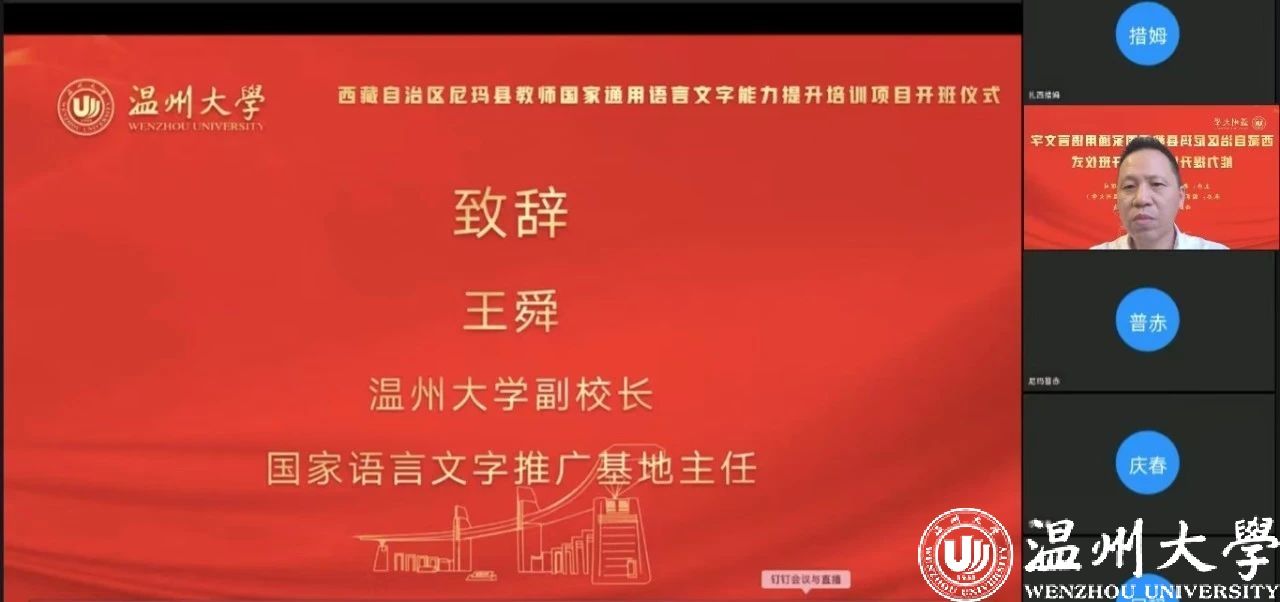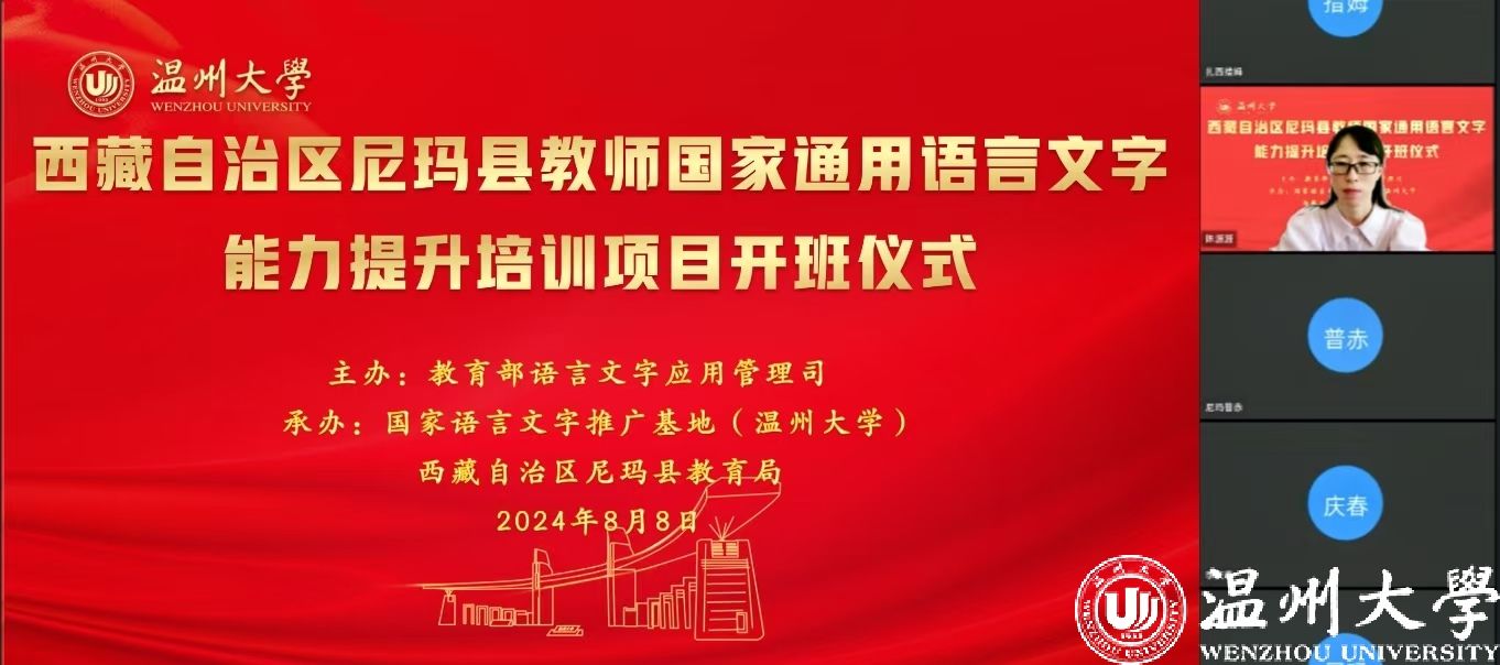 中国教育在线浙江站讯 (编辑 陈显婷 通讯员 温大萱)8月8日上午,由语言文字应用管理司主办,国家语言文字推广基地(永利yl23411官网入口)、西藏自治区尼玛县教育局联合承办的“2024年西藏自治区尼玛县教师国家通用语言文字能力提升培训班”举行了线上开班仪式,国家语言文字推广基地(永利yl23411官网入口)执行主任陈源源教授主持仪式。