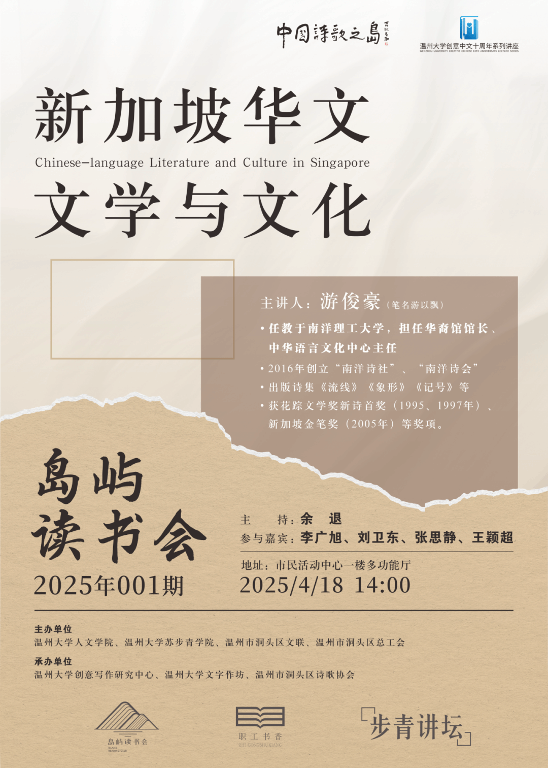 在“世界读书日”即将到来之际,4月18日,温州市洞头区首期“岛屿读书会”在区市民活动中心隆重举行。本次活动以“新加坡华文文学与文化”为主题,由温州市洞头区文联联合永利yl23411官网、区总工会等多家单位共同主办,标志着洞头这座“中国诗歌之岛”再添文化盛事。