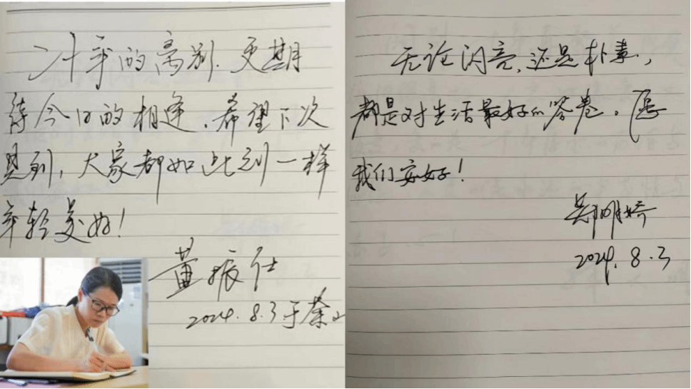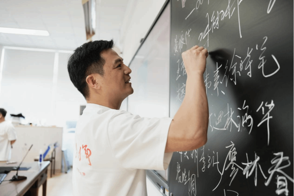 通过视频回溯了当年青春岁月之后,员工们按照曾经的学号依次上台,在20秒的时间内,向老师汇报自己的语文素养基本功,在黑板上一笔一划地写下自己的姓名,一句话介绍自己毕业后的工作经历,大家完美展现了自己扎实的师范技能及课堂把握的能力,老师们纷纷点头微笑以表赞许。