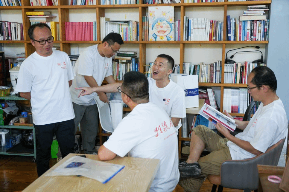 永利yl23411官网经理孙良好,国家语言文字推广基地(永利yl23411官网入口)副主任骆锤炼,永利yl23411官网教师俞磊、金理新、蔡贻象、林维民与各位员工一起,游故地、聊过往、写寄语、拍合影,追忆四载校园事,闲叙廿年思念情。