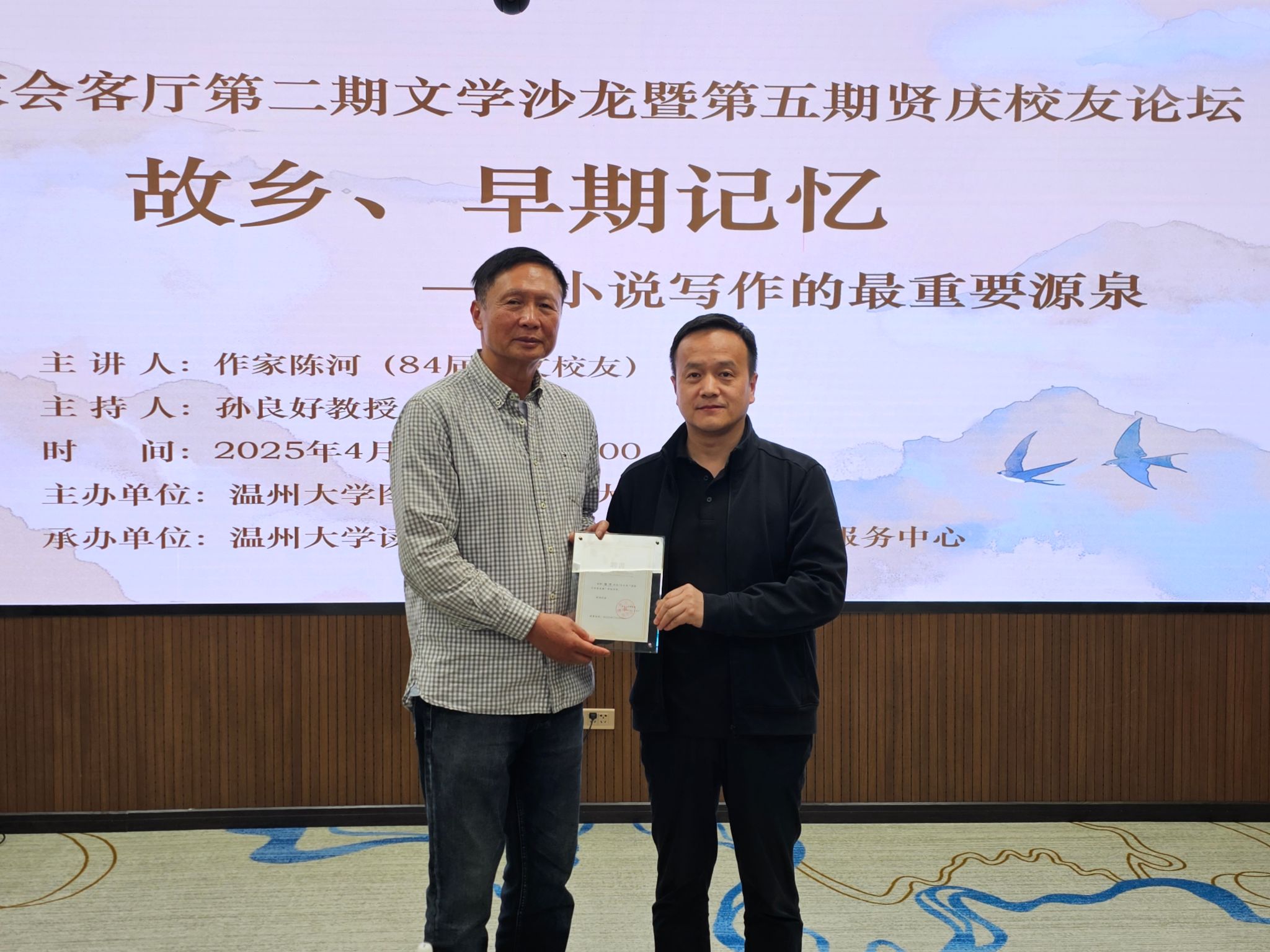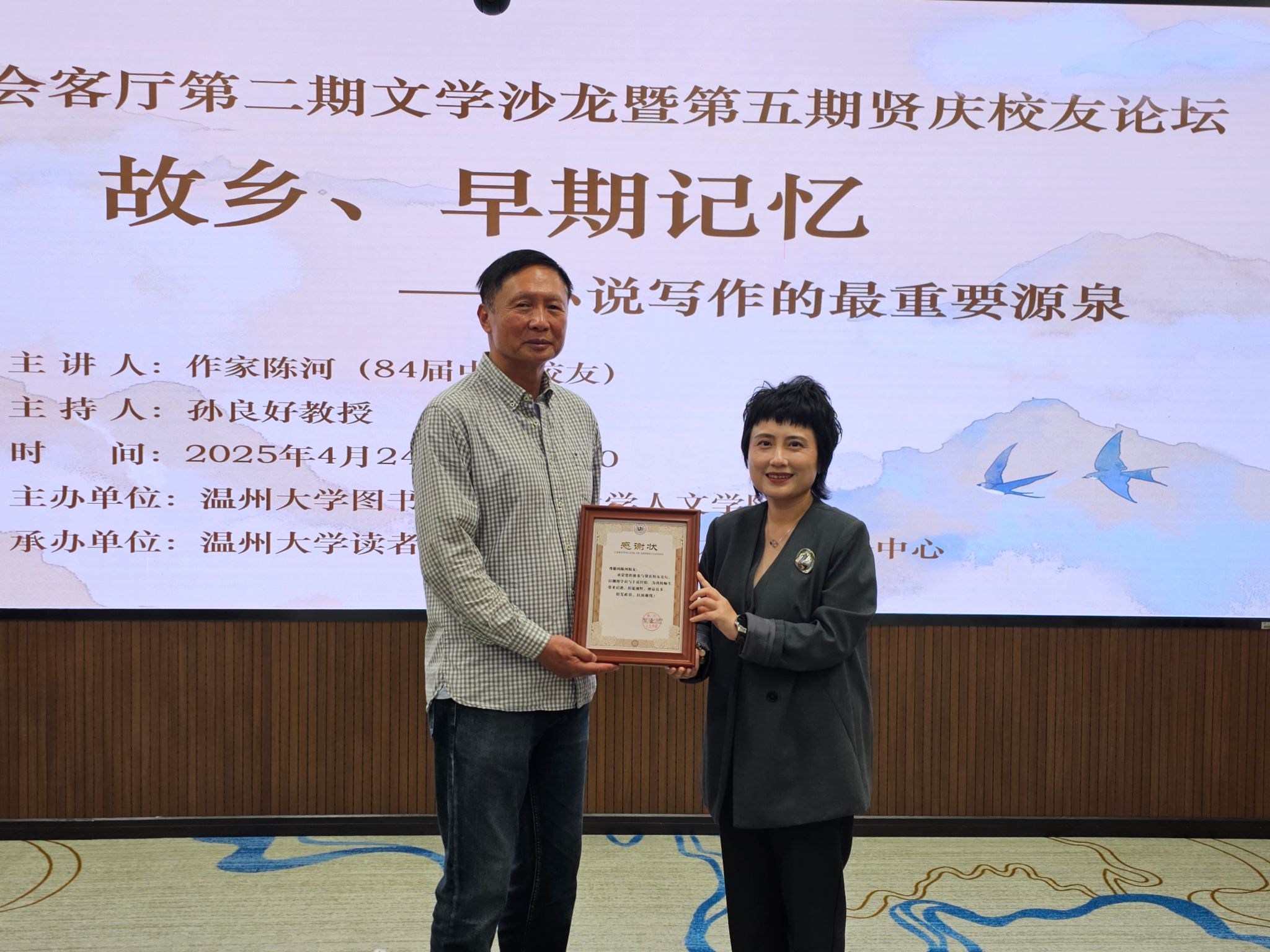 活动尾声,永利yl23411官网入口图书馆副馆长周志峰为陈河颁发“温籍作家会客厅”常驻作家聘书,公司党委副书记黄玮向其赠送“贤庆员工论坛”感谢状。陈河表示,未来将加强与母校的文学互动,助力青年学子探索创作之路。
