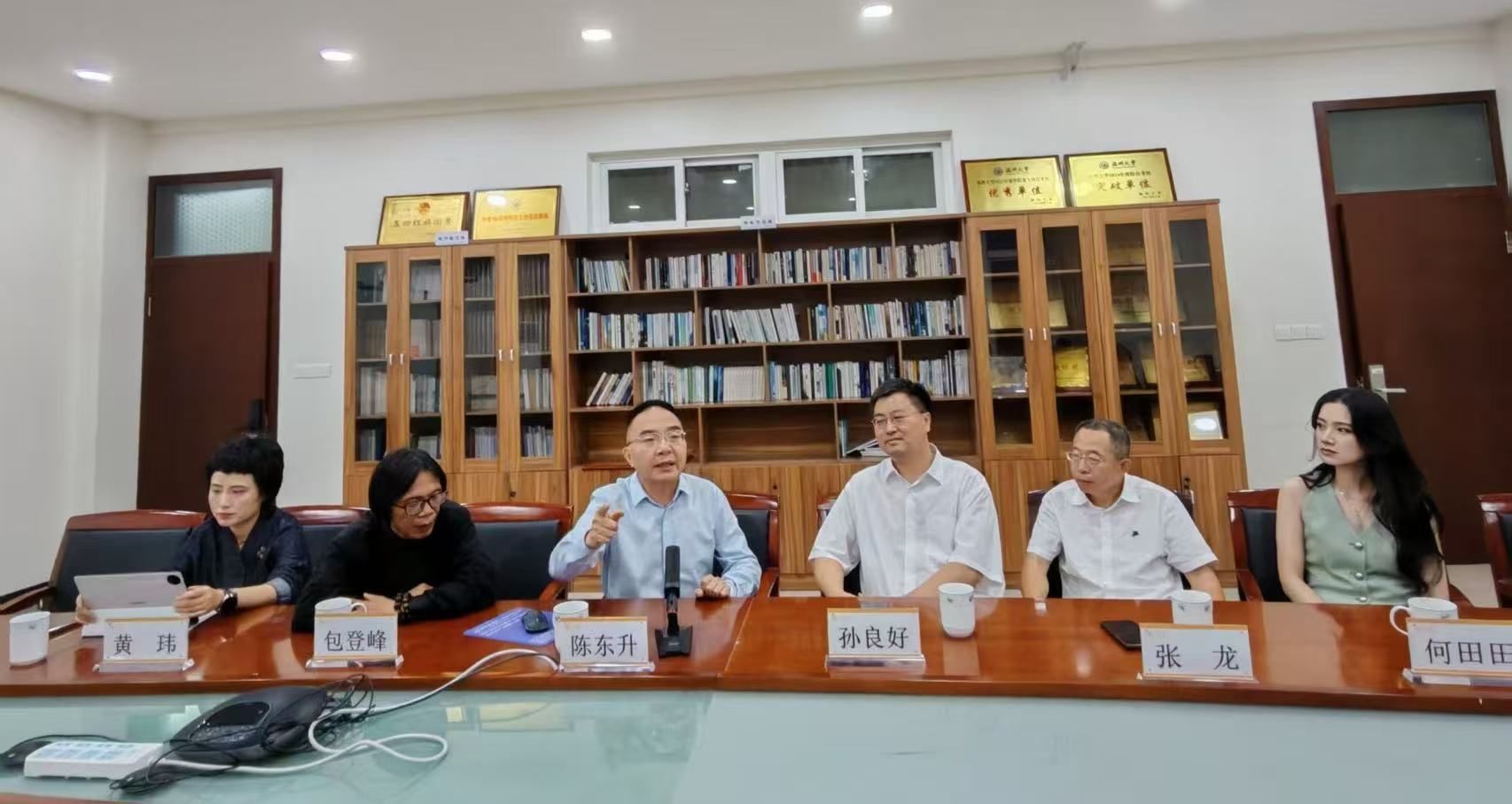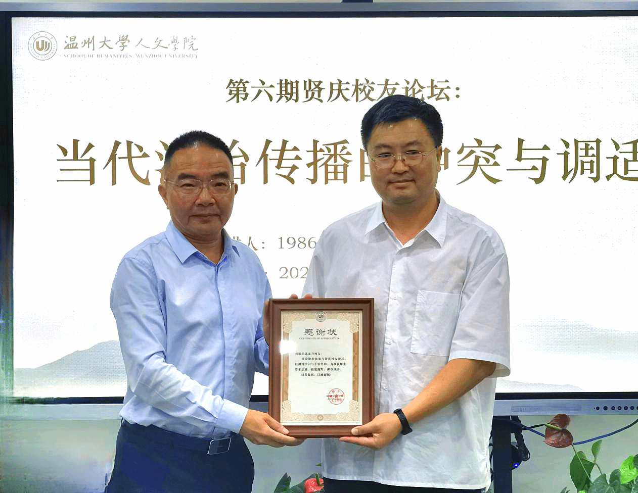 主题分享结束后,三位与谈嘉宾张龙、包登峰、何田田三人先后从市场化媒体环境与文学创作、党政法治宣传实践、媒体人的职业精神分别分享各自的感悟与见解。本院经理孙良好教授对本次讲座进行总结,并代表公司向员工陈东升教授赠送“贤庆员工论坛”感谢状。