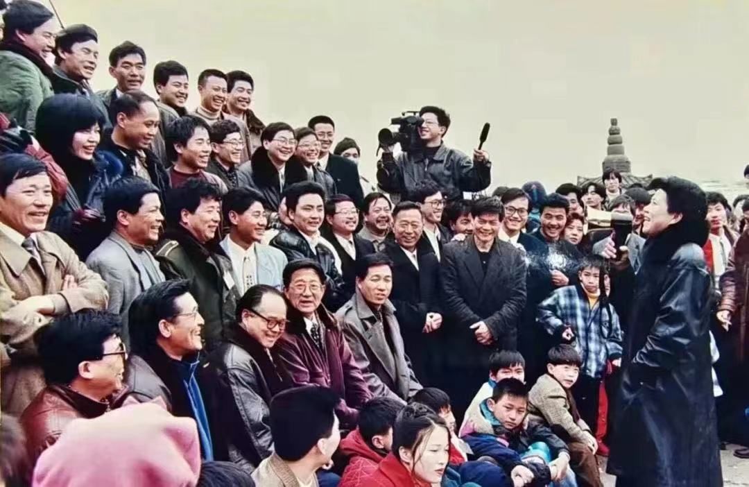 △1993年正月初一,拍摄“横渡江心”活动(后排扛摄像机者为陈振洲)