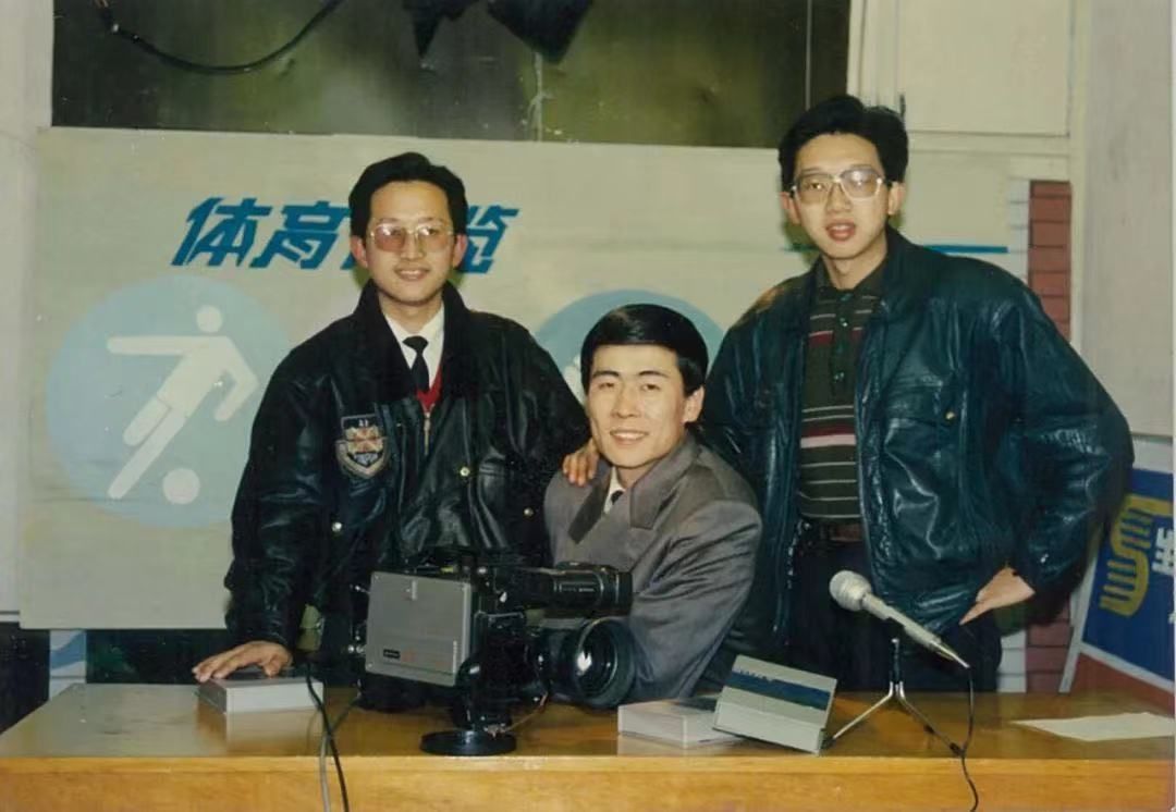 △1991年温州电视台《体育博览》演播厅,陈振洲(右)和主持人王克宁、编辑林建中合影